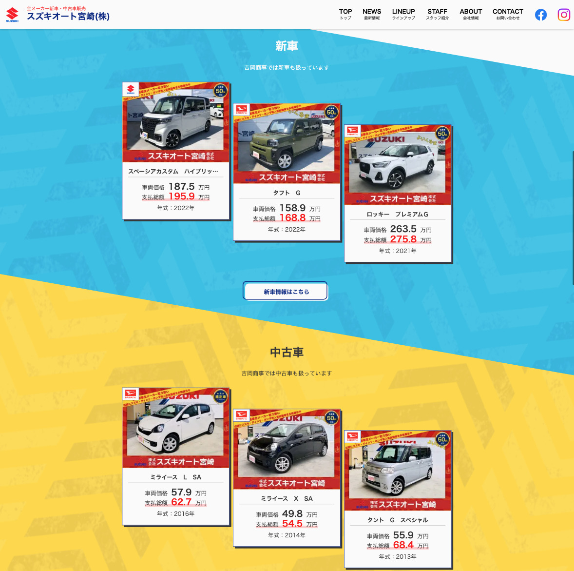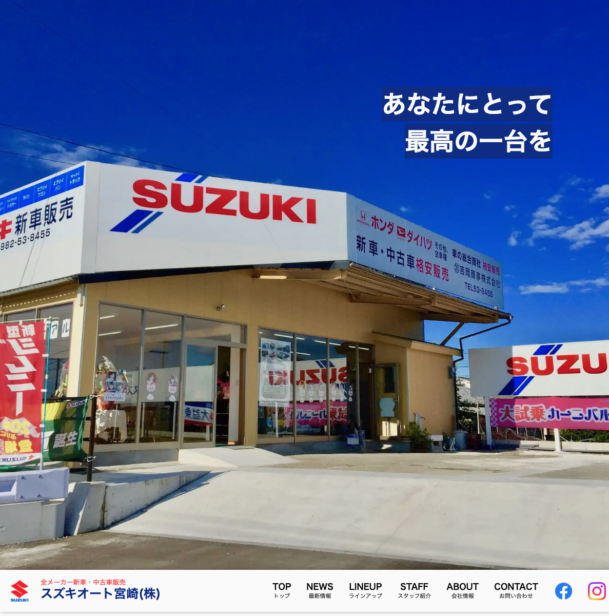 スズキオート宮崎 Field : WordPressコーディングデザイン URL : https://suzuki-auto-miyazaki.com/ スズキオート宮崎様のホームページを制作させて頂きました。 新車、中古車販売から整備まで、車に関するサービスを幅広くされております。 親やすさとかっこよさを重視したデザインでお作りさせて頂きました。 トップには新車と中古車の販売情報が表示されます。 車の販売情報を表示させたいとのご要望があり、ワードプレスを導入しリアルタイムでお車の販売情報が反映されます。
