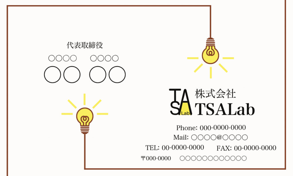 株式会社TSA Lab – ロゴ、名刺 Field : デザイン名刺 株式会社TSALab様からロゴと共に名刺作成のご依頼いただきました。 ロゴは「TSA」の文字がわかりやすいように大きめにデザインし、「A」の中に「Lab」の文字を入れています。 電気を扱う業種とのことで、「A」の文字を電灯に見立ててデザインしました。 名刺はメインカラーを黄色にして、豆電球(アイデア、ひらめき)を使ったデザインにしています。